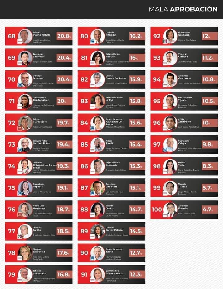 De acuerdo a esta encuesta nacional, los alcaldes mejor evaluados son los del PAN, entre los 32 alcaldes lograron una aprobación promedio del 35 por ciento, le siguen los alcaldes del PRD con un 33.6 por ciento, los de Movimiento Ciudadano con 33.2 por ciento, los del PRI, con un 33.1 por ciento y finalmente los 51 alcaldes de MORENA, obtienen un 31 por ciento, si hay duda sobre esta encuesta la podrán encontrar en la Revista 32, de Junio 2022; “Así va 100 Municipios”.