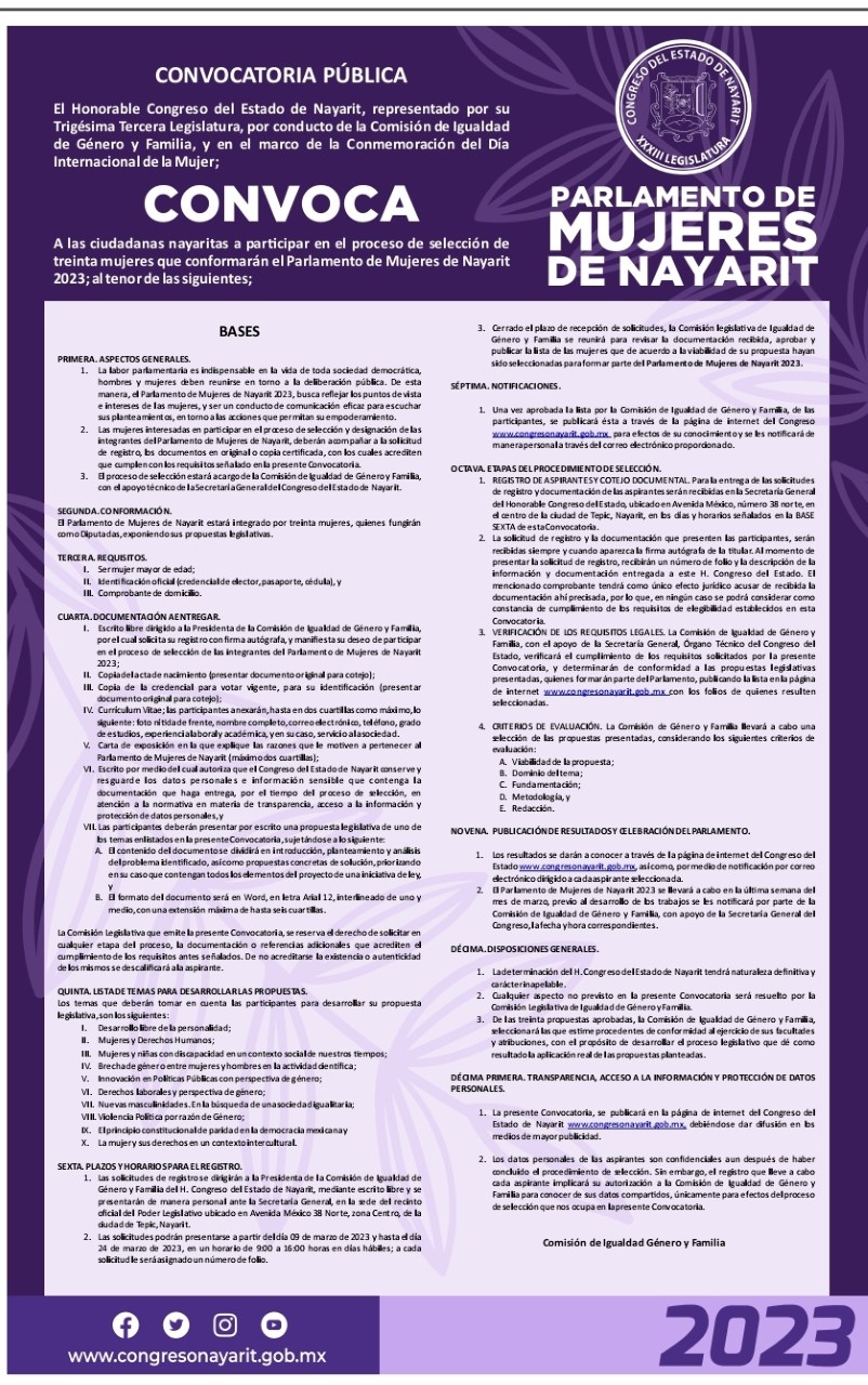 La XXXIII legislatura que encabeza la diputada Alba Cristal Espinoza Peña, está convocando al Segundo Parlamento de Mujeres de Nayarit 2023, para integrar a 30 mujeres que serán diputadas por un día; esto para contribuir a erradicar la desigualdad entre mujeres y hombres y de esta manera contribuir a construir una agenda legislativa de género congruente a la realidad de Nayarit.