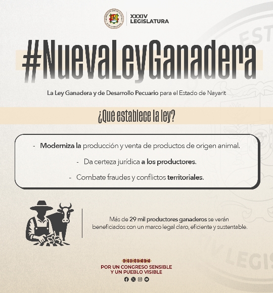 La nueva Ley Ganadera y de Desarrollo Pecuario recientemente aprobada por unanimidad por los diputados de las diferentes fracciones parlamentarias es histórica para la ganadería de Nayarit, da certeza, impulsa la organización y frena los fraudes de miles de productores de la entidad.