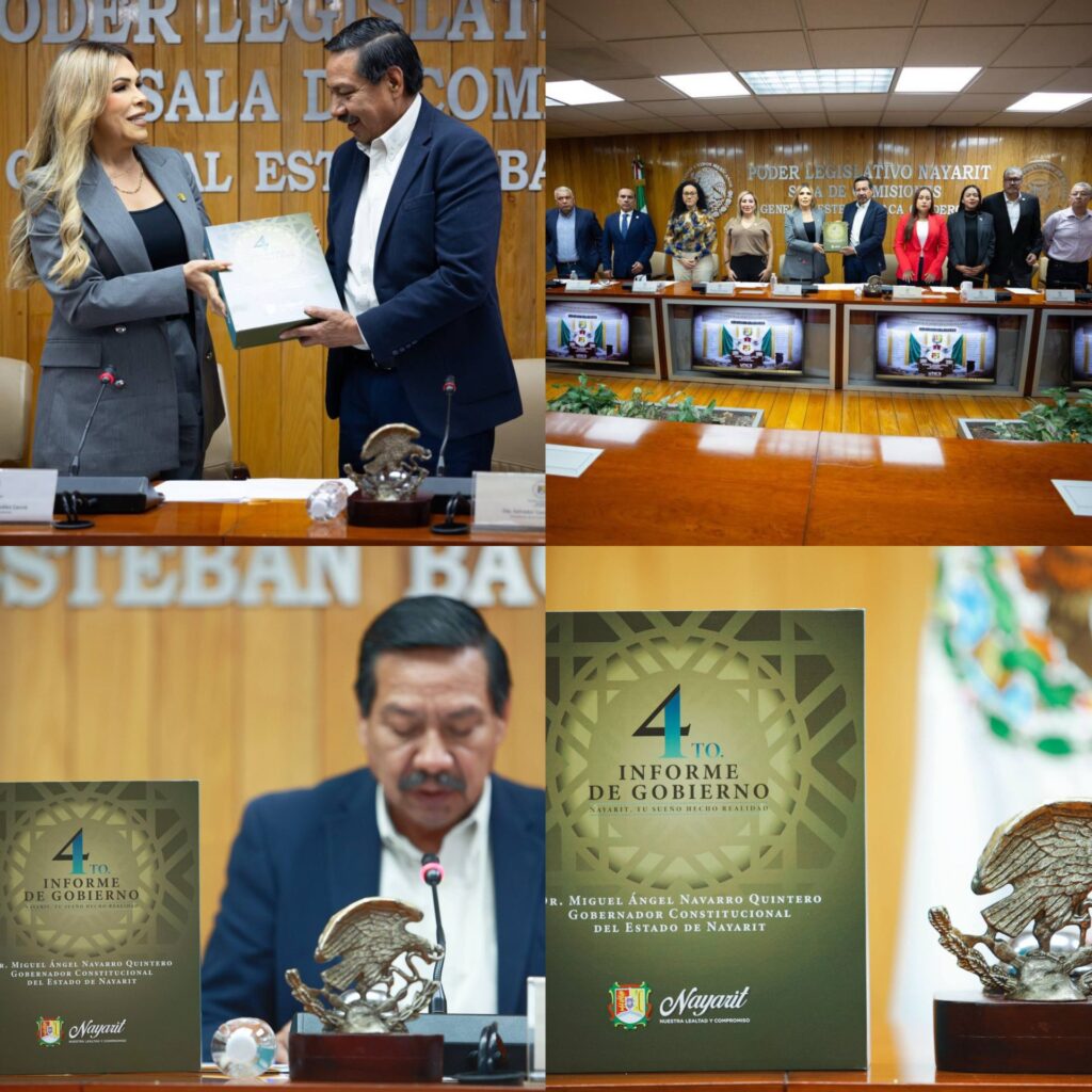 La Cámara de Diputados en su Trigésima Cuarta Legislatura recibió el IV Informe de Gobierno del titular del Poder Ejecutivo, doctor Miguel Ángel Navarro Quintero, documento que detalla el estado que guarda la administración pública estatal, tal como lo establece el artículo 42 de la Constitución Política del Estado de Nayarit.
