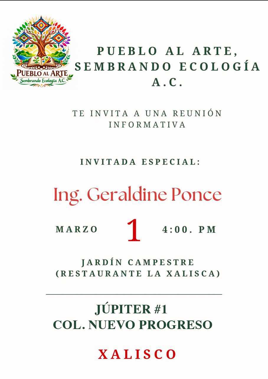 Pero para este domingo 1 de marzo, la cita para escuchar a la hoy surgida como cotizada ponente Geraldine Ponce, es en Xalisco, la hora será igual para todos los eventos a las 4 de la tarde, el lugar en este lugar será en Jardín Campestre, conocido como Restaurante La Xalisca, ubicado en calle Júpiter número 1 en la colonia Nuevo Progreso, en esta ocasión estaremos ante una erudita de arte y ecología.