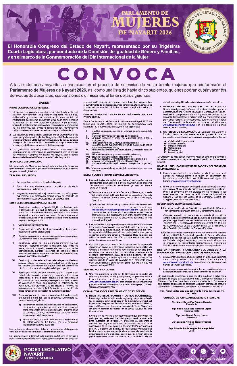 La invitación a todas las mujeres mayores de 18 años, el registro cierra este próximo miércoles 18 de marzo. Se diputada por un día. Las bases para poder participar están en el mega sitio www.congresonayarit.gob.mx
